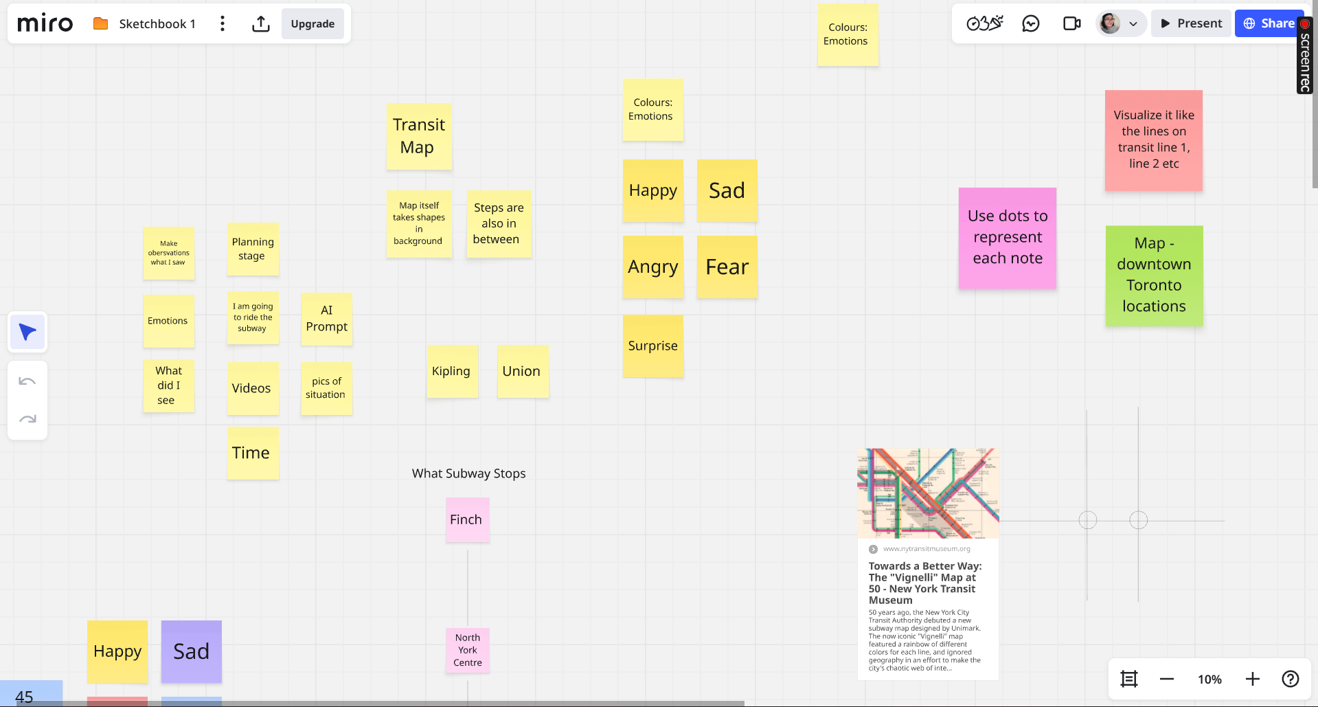 Exploration included emotional research and mapping emotional pacing across stations using Miro. I tracked the fluctuating intensity of the commute, from the quiet anticipation at Finch to the overwhelm at Eglinton.