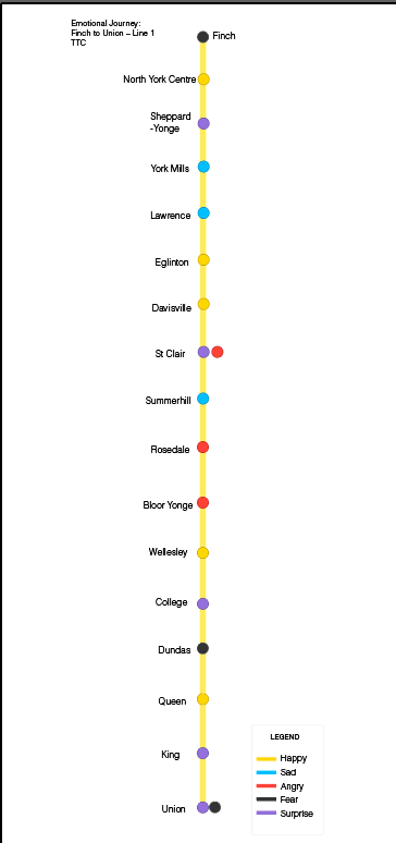 Using a Vignelli-inspired colour system, each TTC station becomes an emotion. The final visual reads like an emotional map of the rider’s inner journey from Finch to Union.